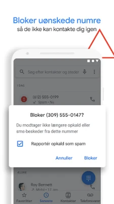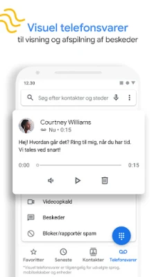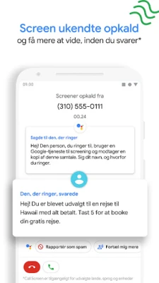 For en endnu mere strømlinet kommunikation introducerer **Opkald** avancerede funktioner, der tager hånd om det besværlige. Forestil dig at få ukendte opkald screenet automatisk; **Opkald** interagerer med dem og identificerer spam, uden at din telefon ringer. Det giver dig indsigt i opkaldets hensigt, før du beslutter dig for at tage det. Og med visuel telefonsvarer er det slut med at ringe ind og lytte. Få dine beskeder leveret direkte i appen, hvor du nemt kan se dem, afspille i vilkårlig rækkefølge, læse transskriptioner og organisere dem uden besvær.