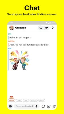 Snapchat revolutionerer den måde, du deler minder på. Send billeder og videoer, der forsvinder, leg med filtre og linser, og opdag historier fra hele verden. En unik platform for kreative og spontane øjeblikke med dine venner.